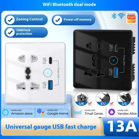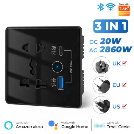 A Wi-Fi smart wall socket that combines multiple power and charging options in one unit — designed to replace a regular wall outlet.
